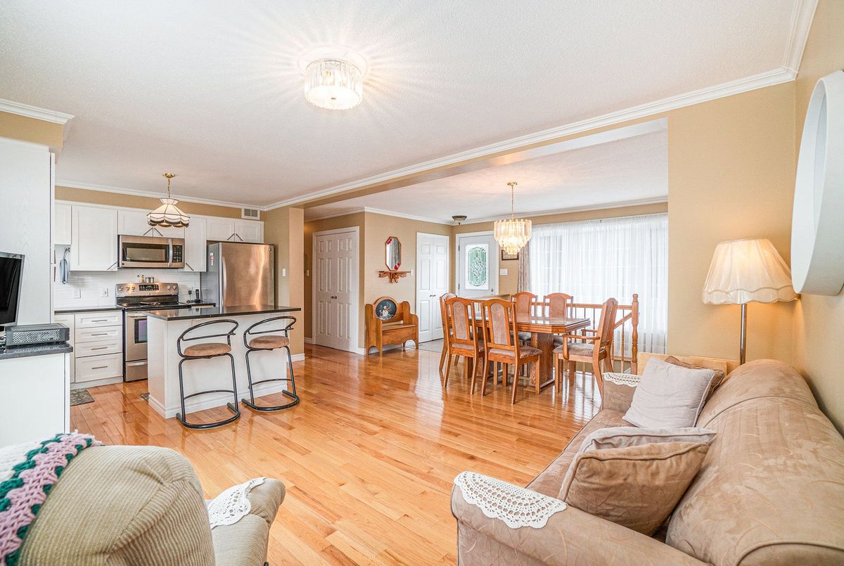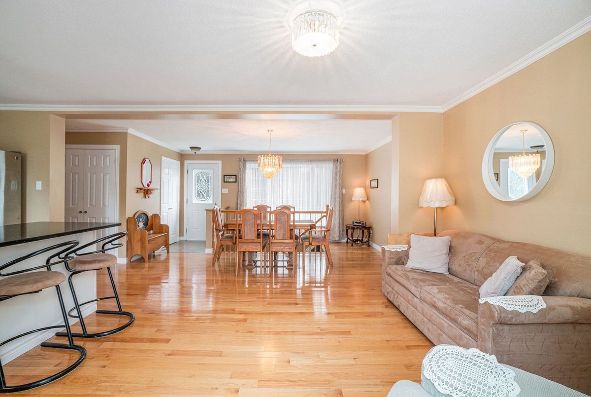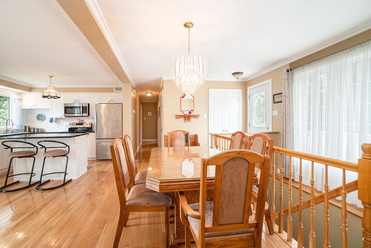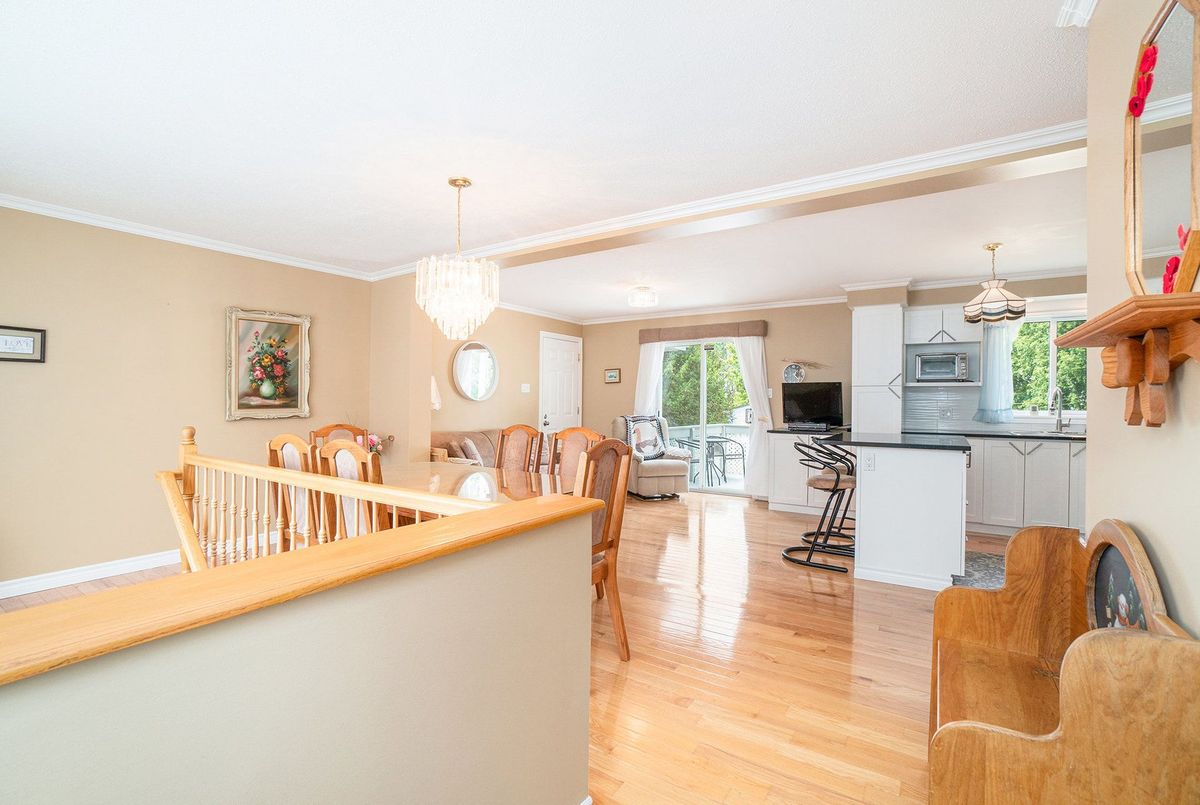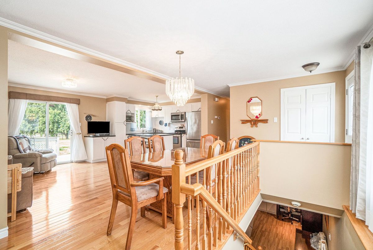 Don't miss this charming raised bungalow, nestled on a sprawling 3/4-acre lot with no rear neighbours in the highly sought after community of Metcalfe. This well-maintained 1999-built home showcases a bright open-concept kitchen, living, and dining area, ideal for effortless entertaining, with gleaming hardwood floors throughout. The kitchen boasts ample counter and cabinet space, island/breakfast bar, sleek dark quartz countertops, and a tile backsplash. The primary bedroom features a spacious 4-piece ensuite and a deep closet, while the second bedroom provides generous space and abundant natural light. A dedicated main floor laundry closet and deep front entrance closet enhance everyday functionality. Another sizeable 4pc bathroom w/ shower bath completes the main floor. The wide staircase invites you to a versatile lower level, primed for your vision with potential for 1-2 additional bedrooms and equipped with a bathroom rough-in. The oversized and insulated 2-car garage is a dream for hobbyists or storage needs. Conclude your day by unwinding on the rear deck, soaking in the tranquillity of rural living on a expansive tree-lined lot. Walking distance to several schools & parks, Larry Robinson Arena, local events, & the Metcalfe Fairgrounds. This home awaits your personal touch, book a viewing today. Updates Include: New Front Door, Pressure Tank 2024. Sump pump w alarm + battery backup 2023. Gas HWT & Furnace Feb 2021. A/C March 2022. Septic, Well, & Windows are original. Roof is approx 10 yrs old. Iron Filter & Water Softener 10 yrs old. Recent 0/0 Water Test Result
