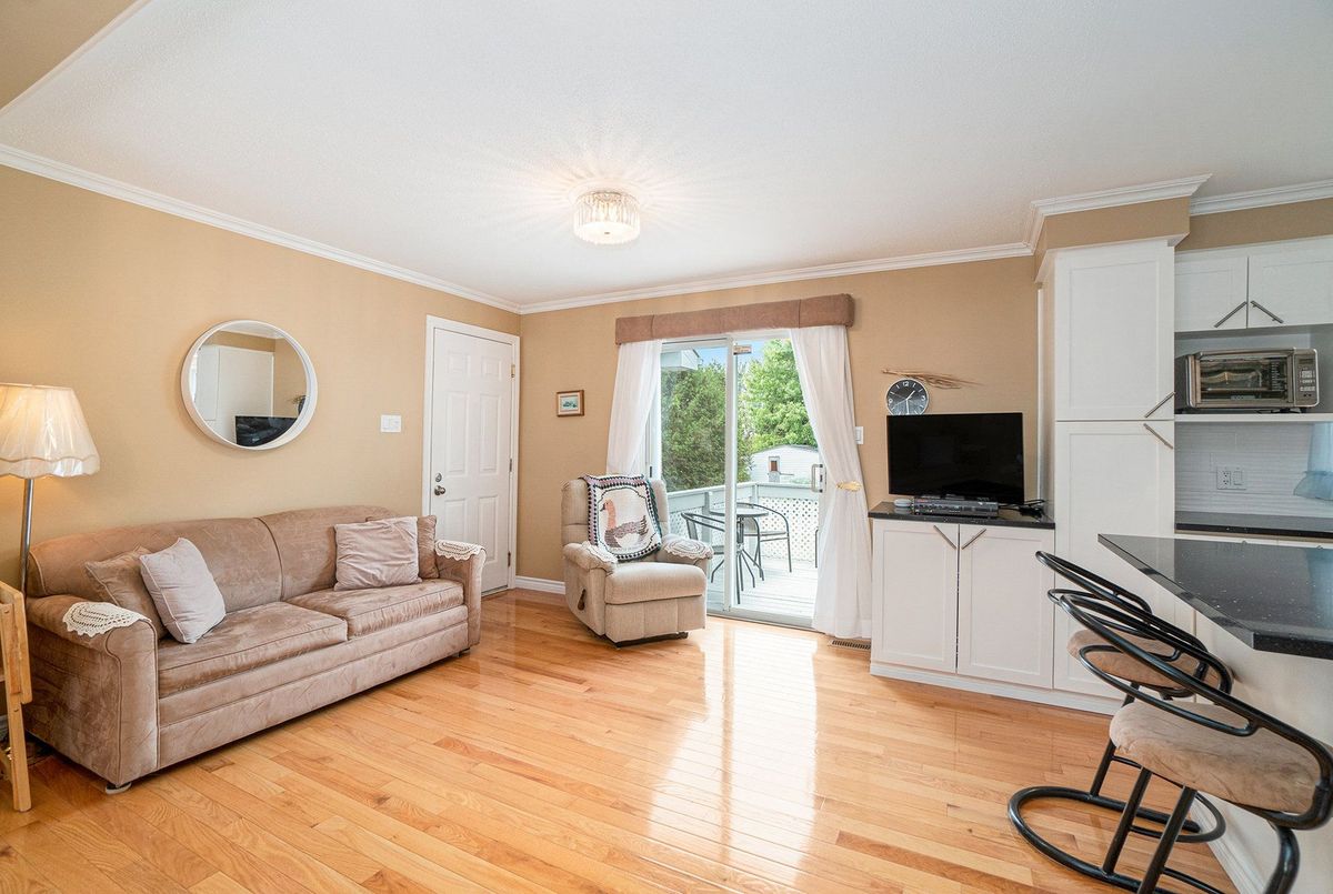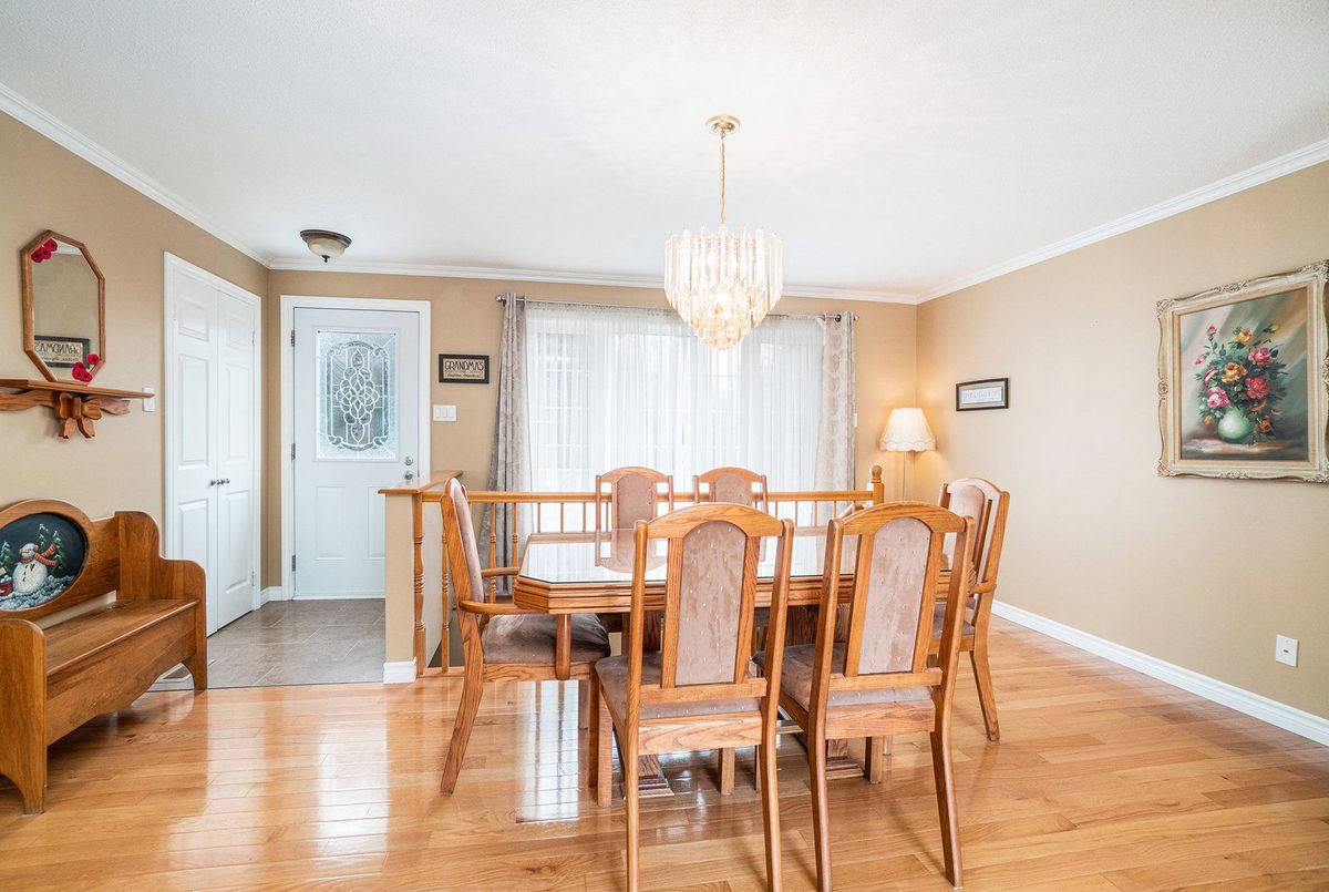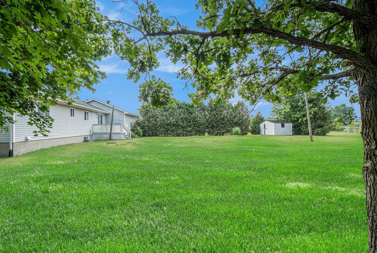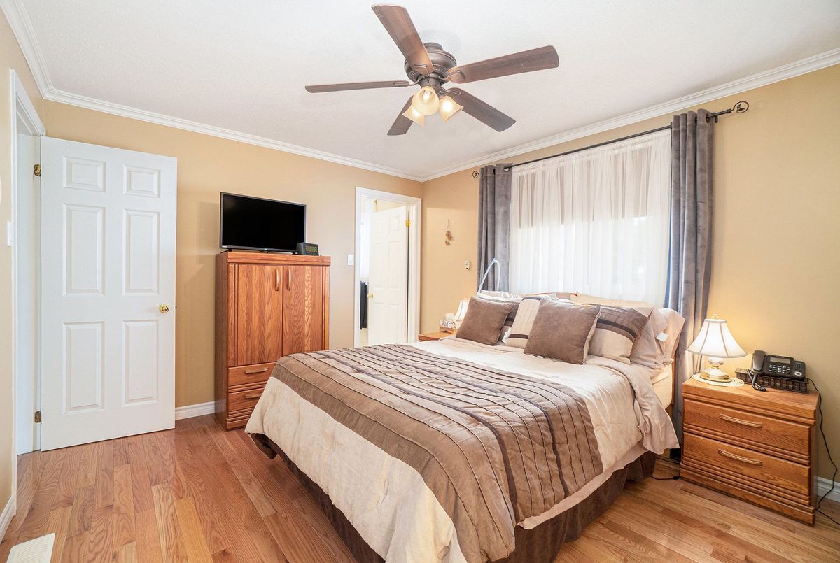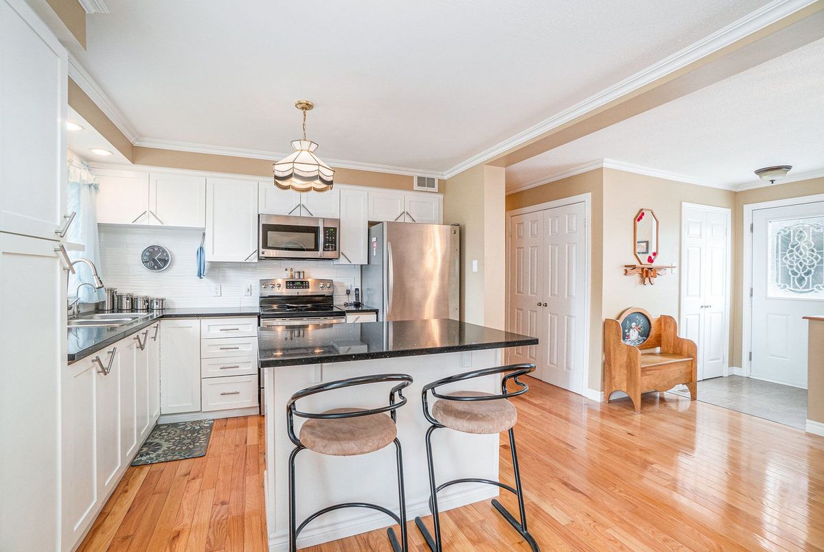 Don't miss this charming raised bungalow, nestled on a sprawling 3/4-acre lot with no rear neighbours in the highly sought after community of Metcalfe. This well-maintained 1999-built home showcases a bright open-concept kitchen, living, and dining area, ideal for effortless entertaining, with gleaming hardwood floors throughout. The kitchen boasts ample counter and cabinet space, island/breakfast bar, sleek dark quartz countertops, and a tile backsplash. The primary bedroom features a spacious 4-piece ensuite and a deep closet, while the second bedroom provides generous space and abundant natural light. A dedicated main floor laundry closet and deep front entrance closet enhance everyday functionality. Another sizeable 4pc bathroom w/ shower bath completes the main floor. The wide staircase invites you to a versatile lower level, primed for your vision with potential for 1-2 additional bedrooms and equipped with a bathroom rough-in. The oversized and insulated 2-car garage is a dream for hobbyists or storage needs. Conclude your day by unwinding on the rear deck, soaking in the tranquillity of rural living on a expansive tree-lined lot. Walking distance to several schools & parks, Larry Robinson Arena, local events, & the Metcalfe Fairgrounds. This home awaits your personal touch, book a viewing today. Updates Include: New Front Door, Pressure Tank 2024. Sump pump w alarm + battery backup 2023. Gas HWT & Furnace Feb 2021. A/C March 2022. Septic, Well, & Windows are original. Roof is approx 10 yrs old. Iron Filter & Water Softener 10 yrs old. Recent 0/0 Water Test Result