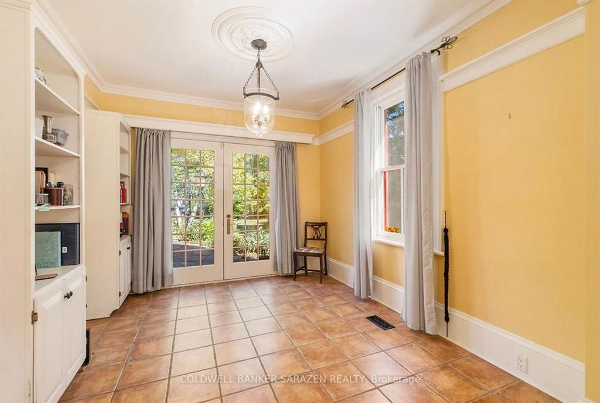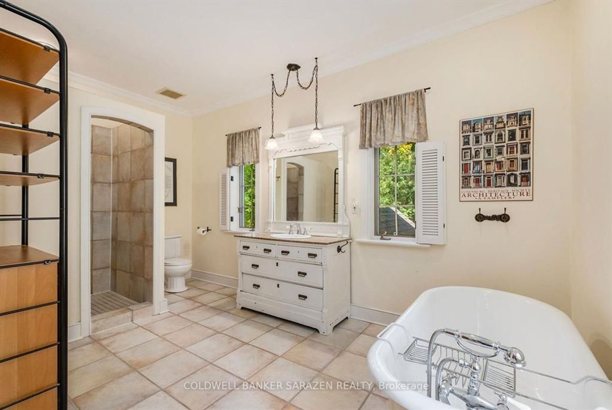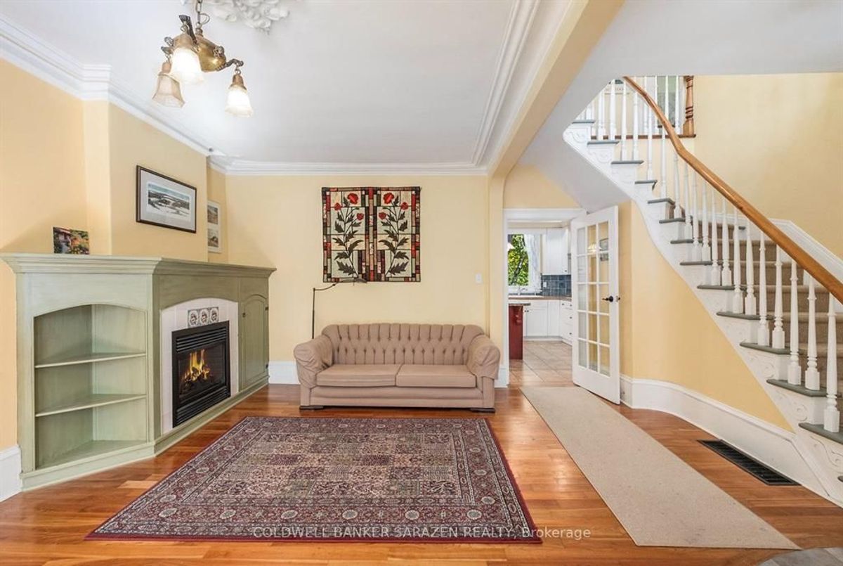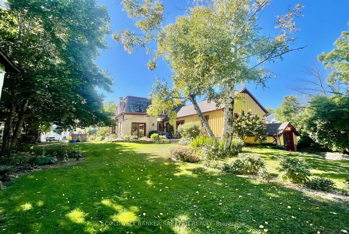 61 Drummond ST E Stunning 4 bdrm Heritage Century home formerly known as Waddell House. Sculpted crown moldings, gleaming wide plank wood floors, high ceilings, bay windows, feature fireplace, main floor master bdrm with french doors to private patio overlooking grounds,gardens and gazebo, ensuite bath with antique tub, Gourmet kitchen with island and parisian styling, formal diningrm with adjoining den, fin basement with workshop and storage, open concept 2nd floor with famrm, grande staircase, charming front porch, newer furnace, generator, gazebo, patio and wrap around pampered gardens. Beautifully presented.