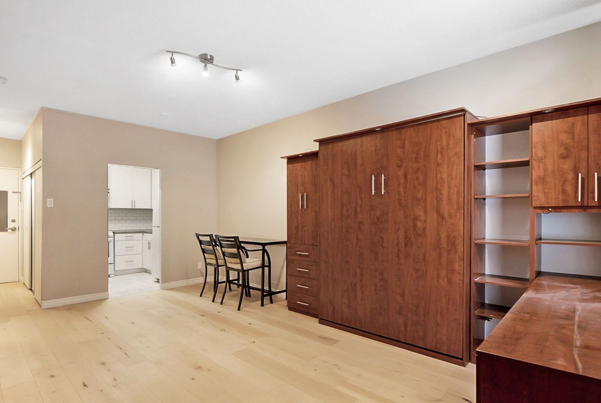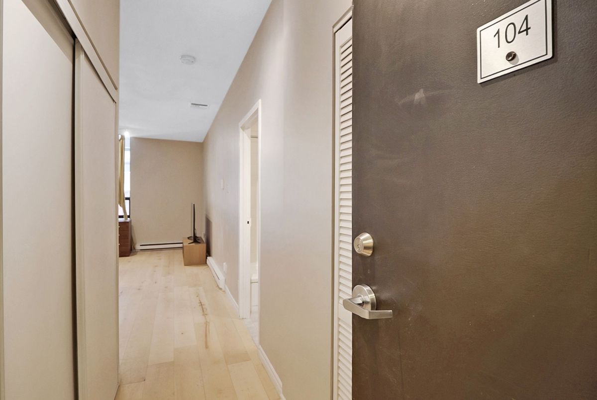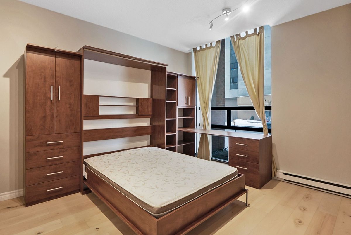 Welcome to 104-475 Laurier Avenue West, a turnkey ground-floor studio in a quiet, concrete building with only one neighbour and central A/C, central heating and high ceilings. Thoughtfully renovated in 2025 with new engineered maple hardwood floors, kitchen cabinets, counters, flooring, updated bathroom vanity, reglazed tub, fresh paint, and updated lighting. The smart layout features a fully partitioned kitchen and a built-in Murphy bed and desk positioned by a large operable window ideal for working or studying from home. One parking space is available for an additional cost. Walk Score 98, Bike Score 98, Rider Score 91. Steps to the LRT, Ottawa River, university, shops, restaurants, and the new main library. Perfect for first-time buyers, downsizers, investors, or home-based professionals.