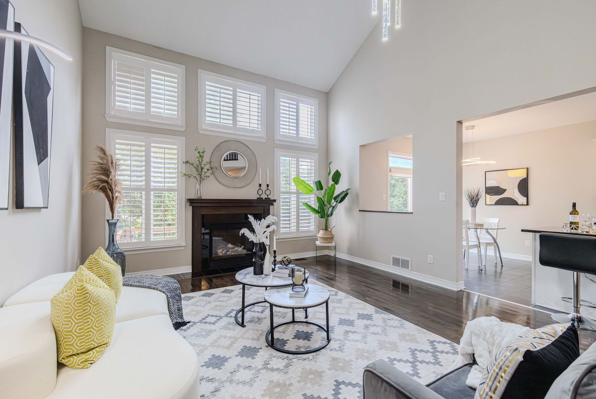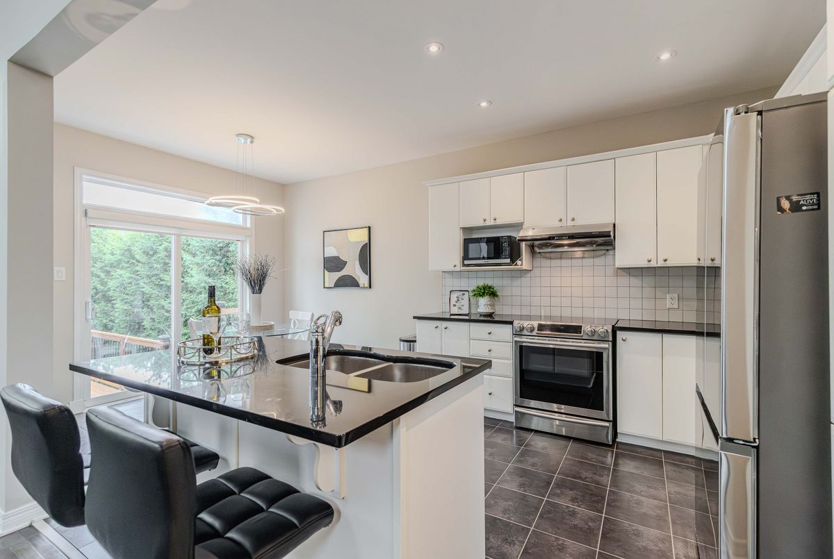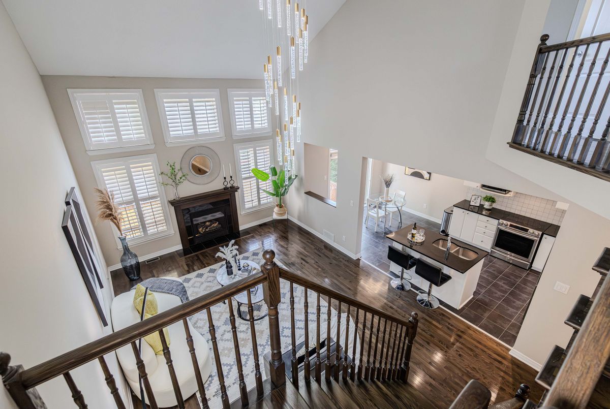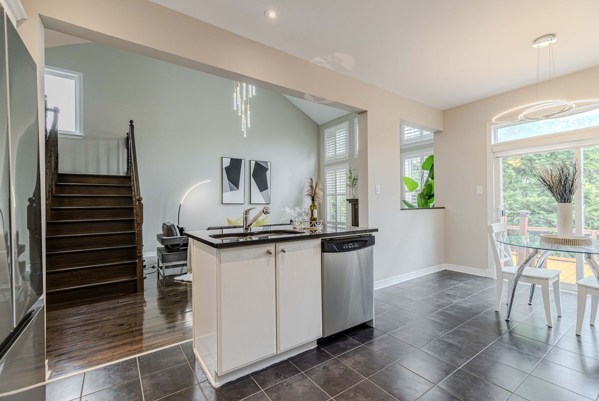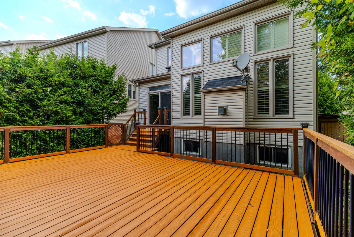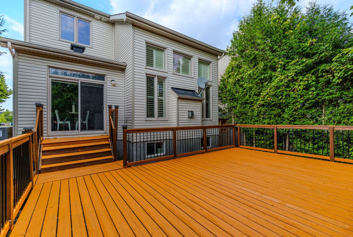 Prime location directly facing a park! Stunning full brick façade with a charming front porch. The main floor boasts a spacious open-conceptdesign, featuring a soaring two-storey living room with a dramatic wall of windows adorned with California shutters. The transitional-style kitchen includes sleek black granite countertops and a contemporary tile backsplash. Adjacent eat-in area leads to a generous 24x16 ft deck with sunny western exposure perfect for evening gatherings. Elegant hardwood staircase leads to the upper level. The expansive primarybedroom features vaulted ceilings. The fully finished lower level offers a full bathroom, 4th bedroom, and a comfortable family/rec room.