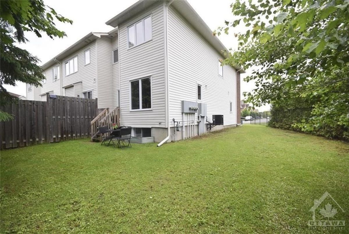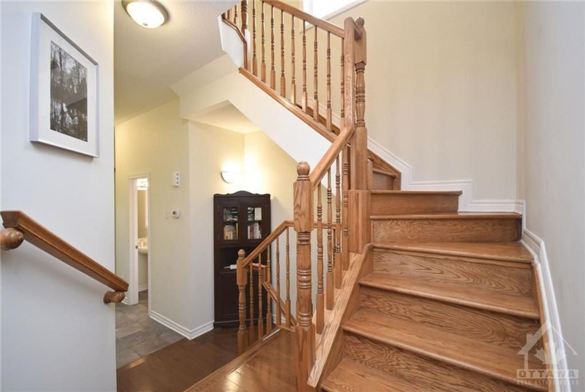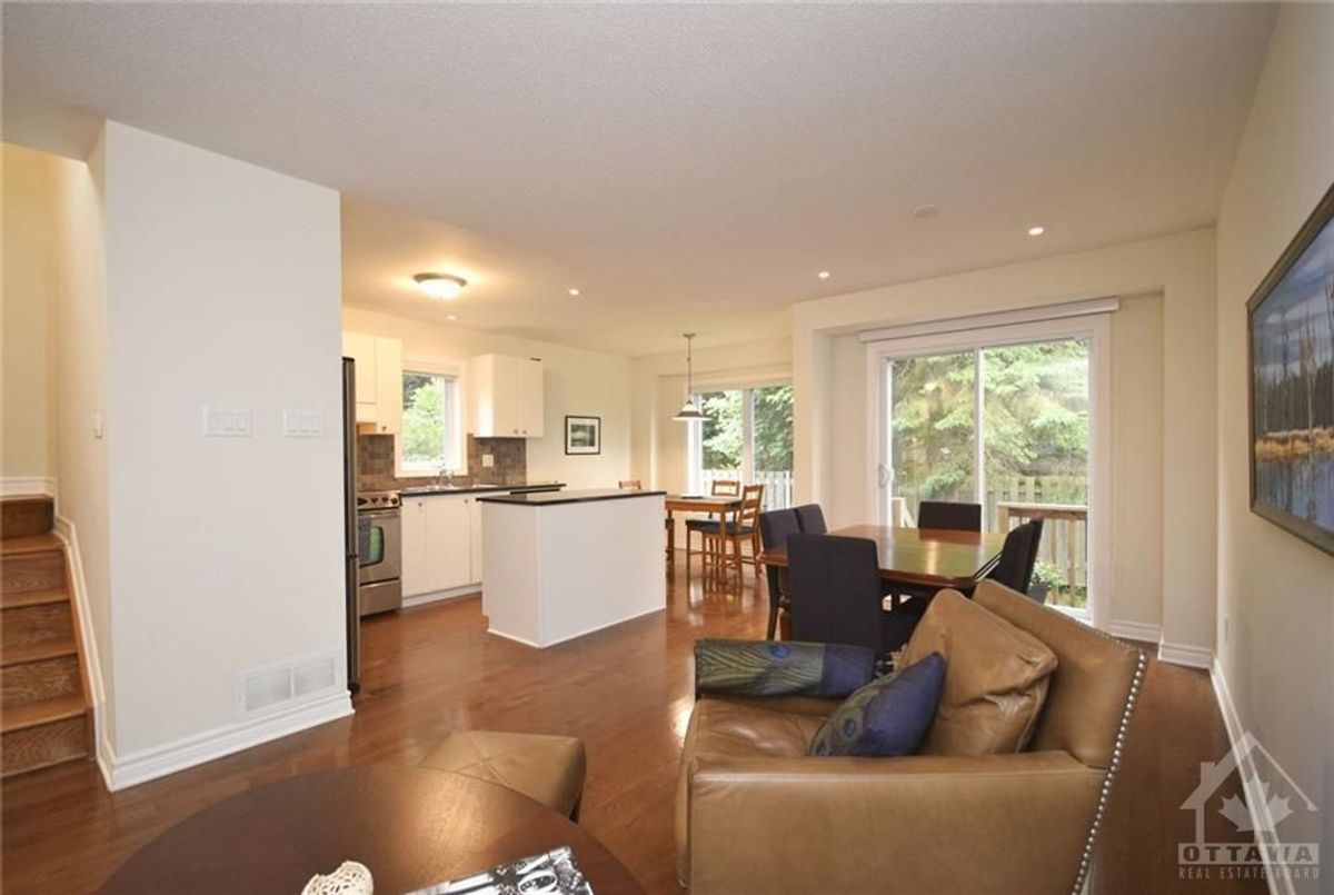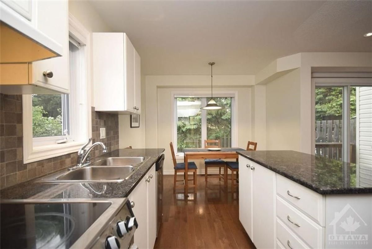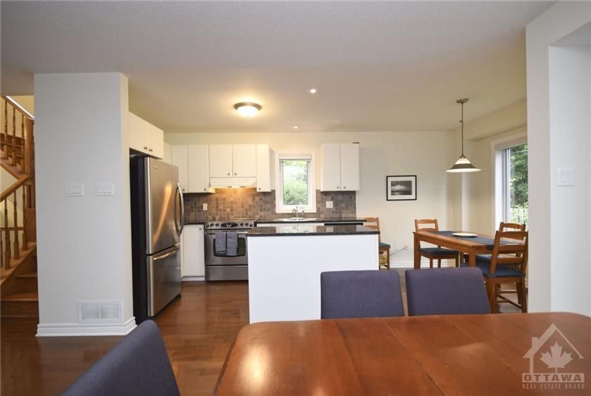 Impressive end-unit Minto 3-Bedroom townhome with prime oversized lot. Modern open-concept design with rich oak hardwood flooring on main level, stairs, and second floor. Elegant living room and dining room. Sun-filled eat-in kitchen with modern white cabinetry, and island. Granite counters, and slate backsplash. Window in kitchen with view of park and S/S appliances. Patio doors from living and dining room extends your living to the outdoors. Primary bedroom with walk-in closet and en-suite bathroom. Two other bedrooms that are a good size. Main 4-piece bathroom. Family room with gas fireplace. Freshly painted throughout. Tops in Location: CSIS, NRC, CSEC, OC/LRT Transpo, Shopping, School and Parks nearby., Flooring: Hardwood, Flooring: Linoleum, Flooring: Carpet Wall To Wall